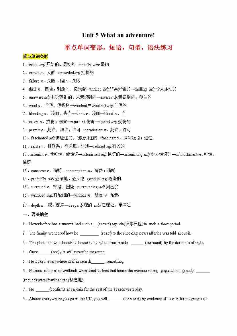 Unit 5 What an adventure! 重点单词变形,短语,句型,语法知识点复习-(外研版2019)