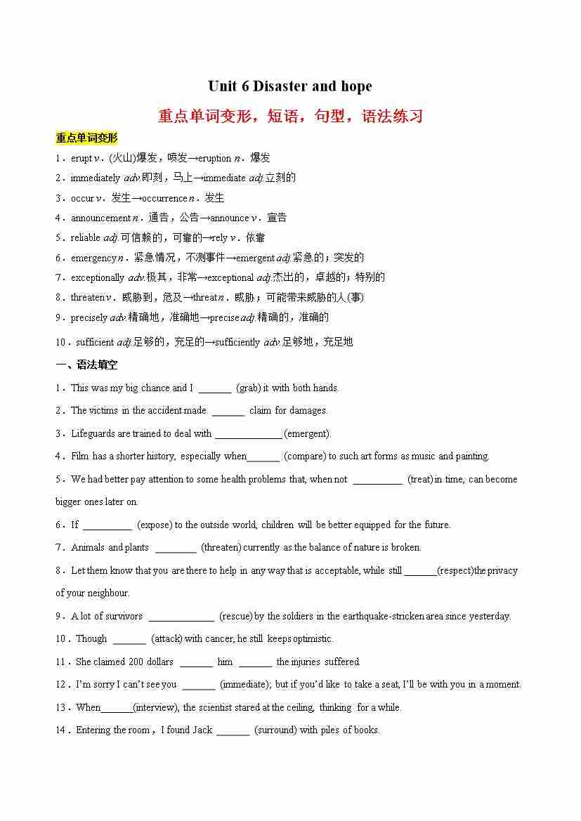 Unit 6 Disaster and hope 重点单词变形,短语,句型,语法知识点复习-(外研版2019)