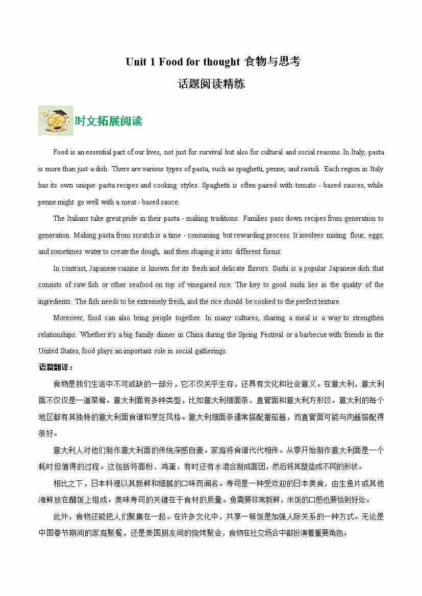 Unit 1 Food for thought 食物与思考(话题阅读精练)(学生版)