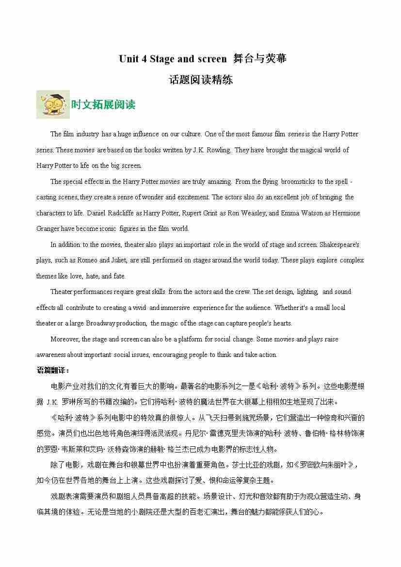 Unit 4 Stage and screen 舞台与荧幕(话题阅读精练)(学生版)