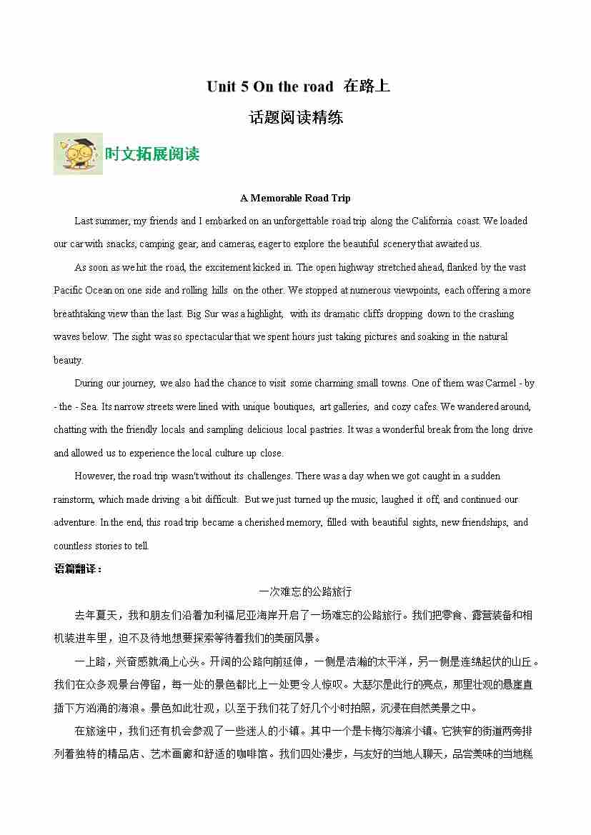 Unit 5 On the road 在路上(话题阅读精练)(学生版)