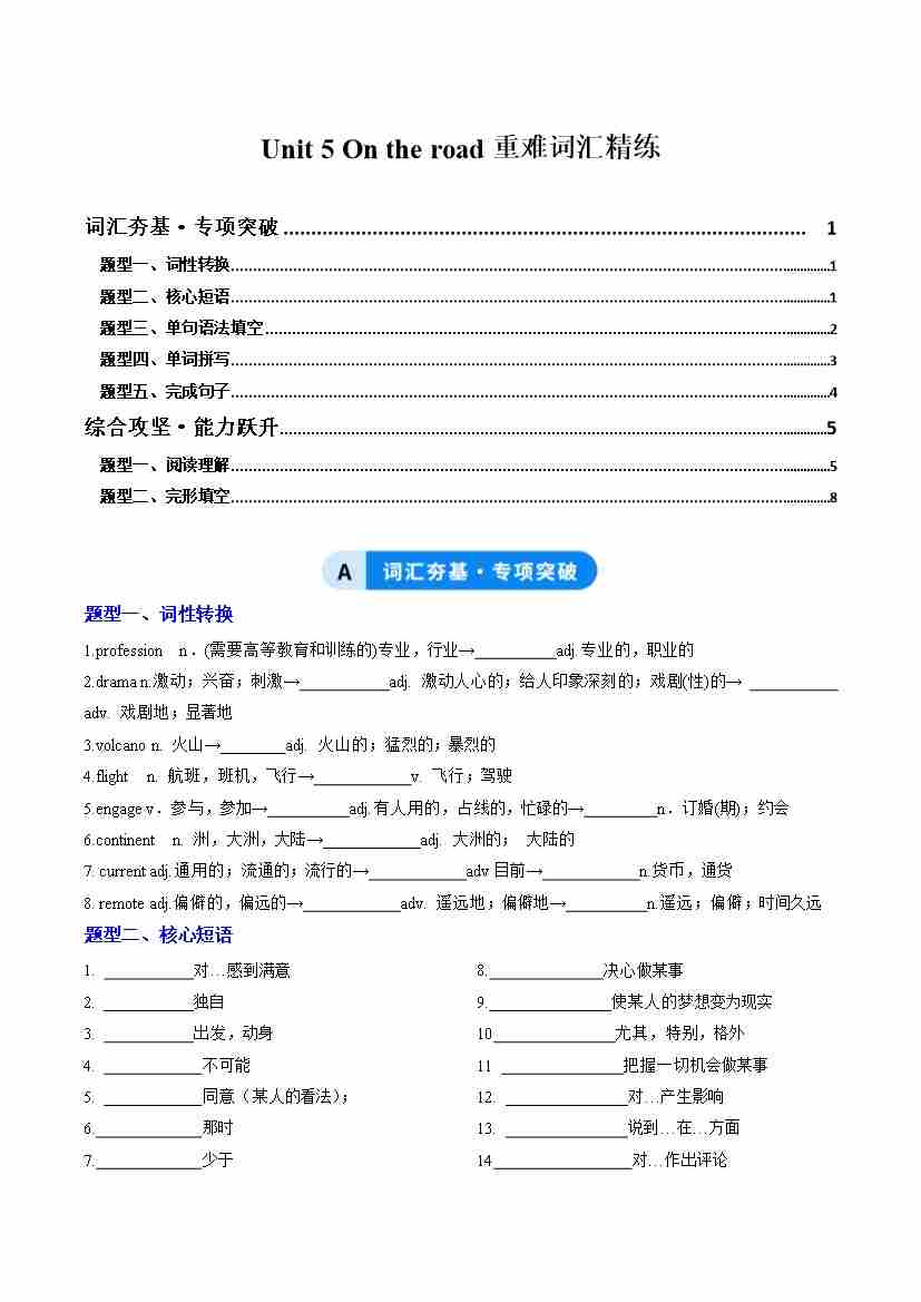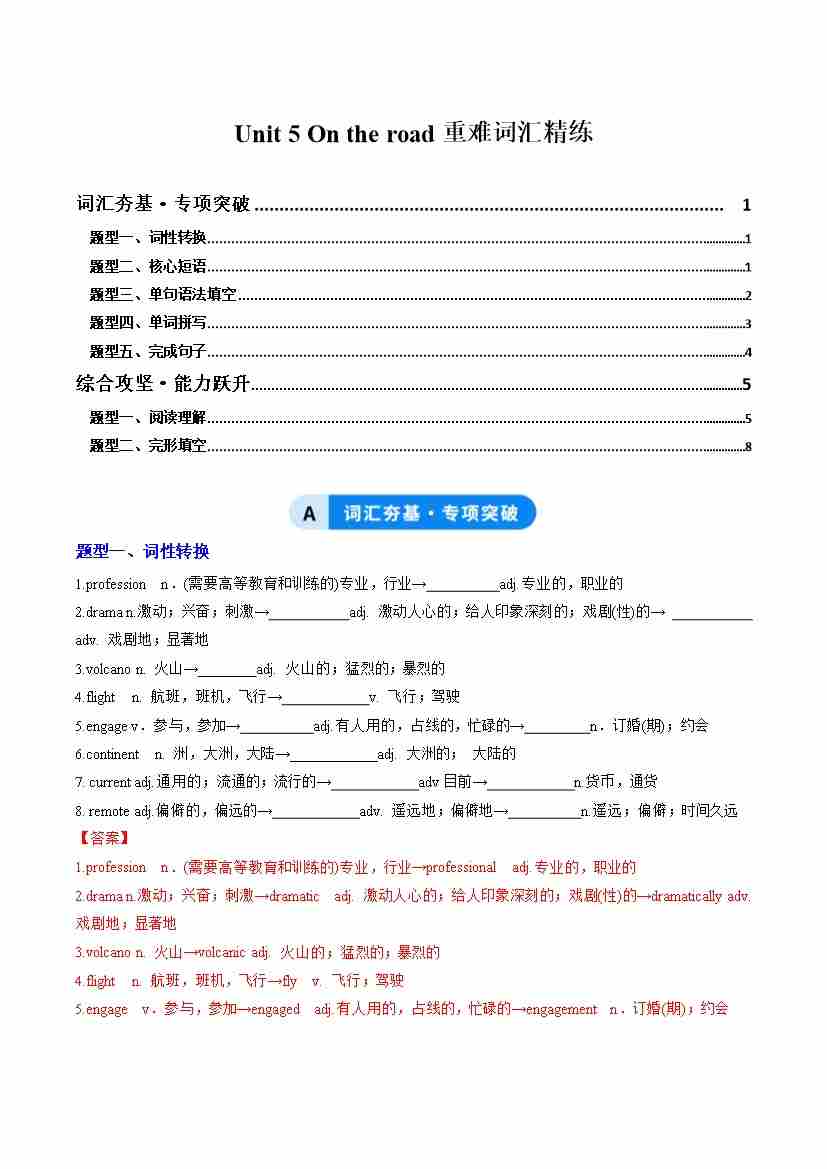 Unit 5 On the road(重难词汇精练)(教师版)