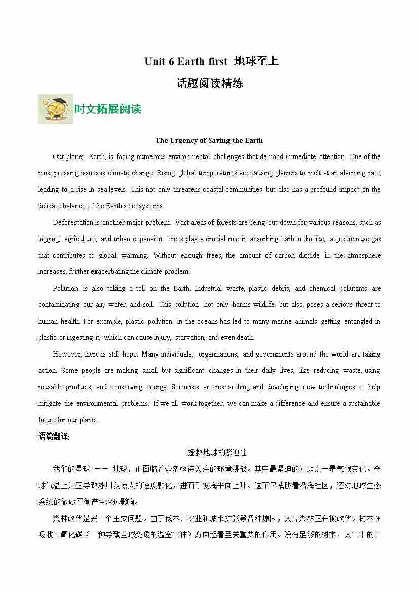Unit 6 Earth first 地球至上(话题阅读精练)(学生版)