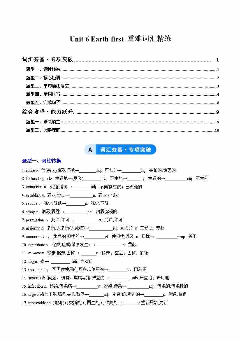 Unit 6 Earth first(重难词汇精练)(教师版)