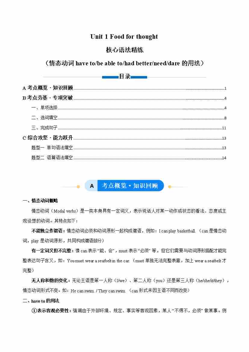 Unit 1 Food for thought情态动词(I)(单元核心语法精练)(学生版)