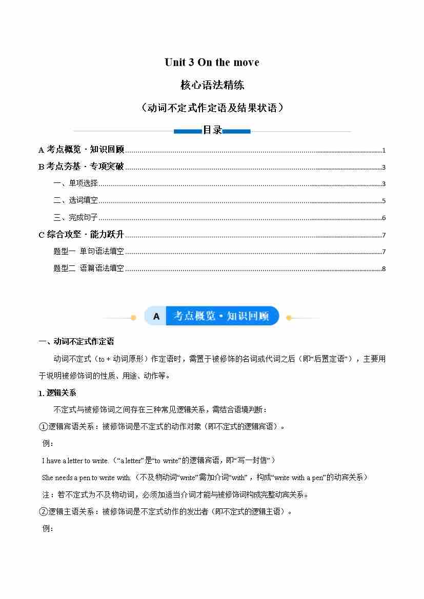 Unit 3 On the move 动词不定式作定语及结果状语(单元核心语法精练)(学生版)