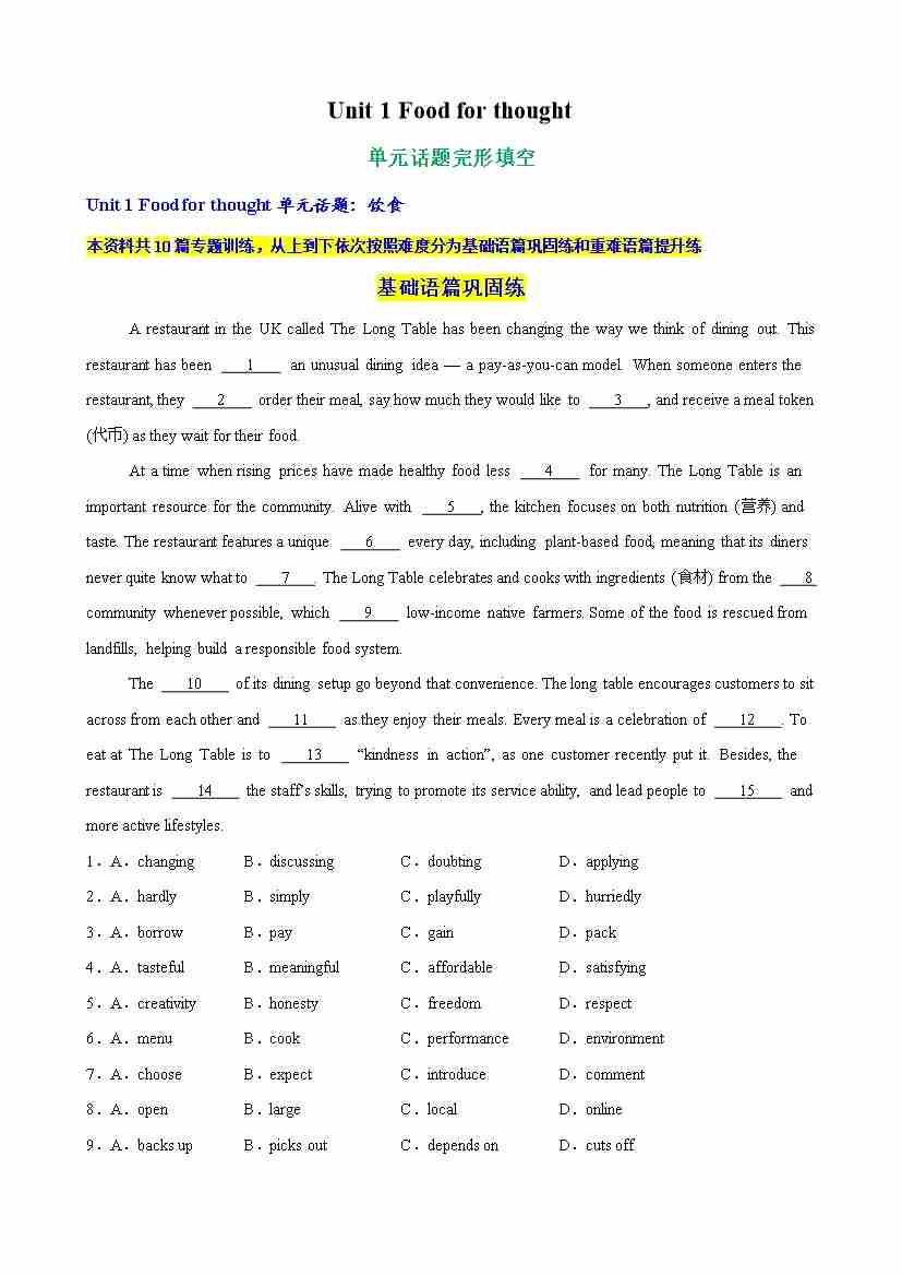 Unit 1 Food for thought单元话题完形填空练习(学生版)