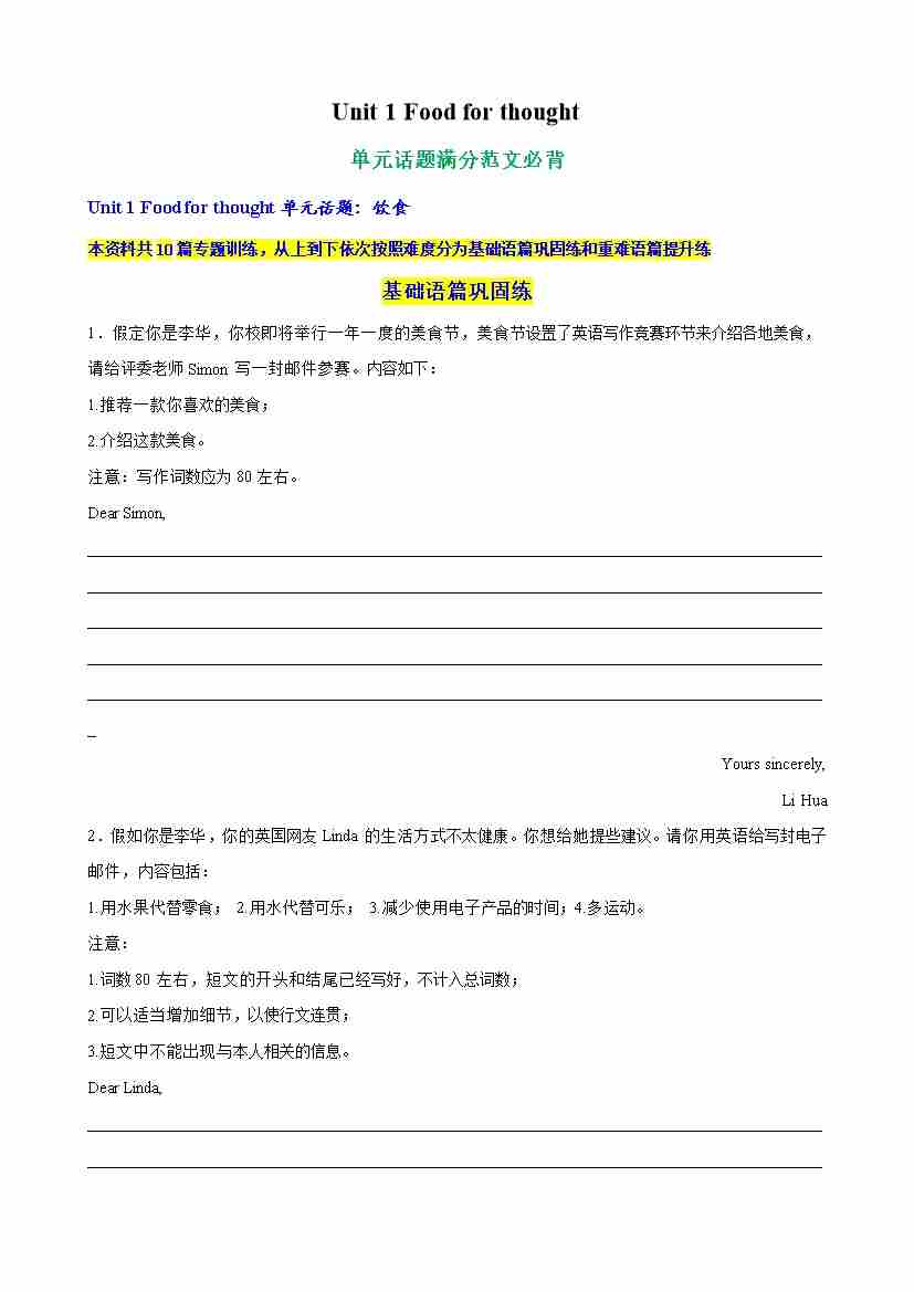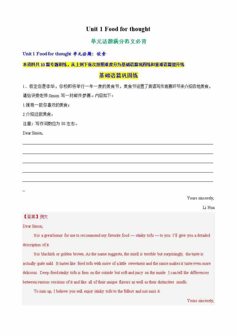 Unit 1 Food for thought单元话题满分范文必背(教师版)
