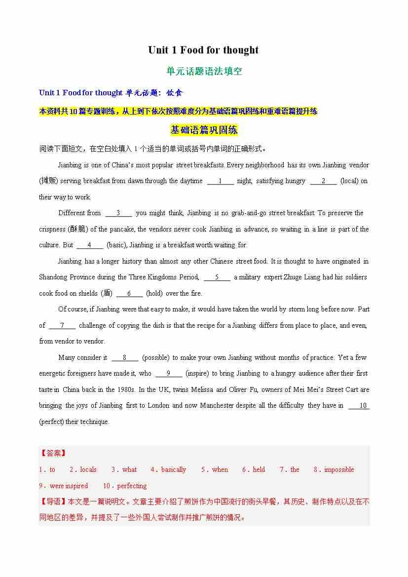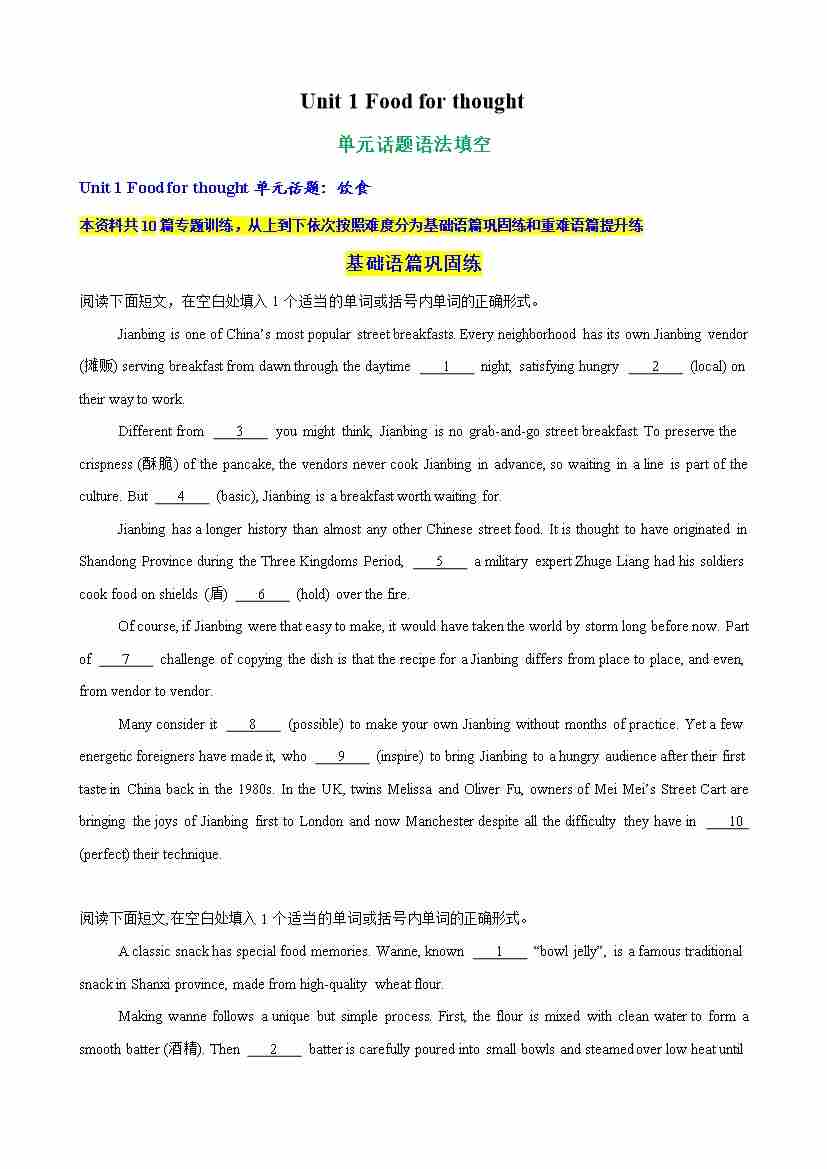 Unit 1 Food for thought单元话题语法填空练习(学生版)