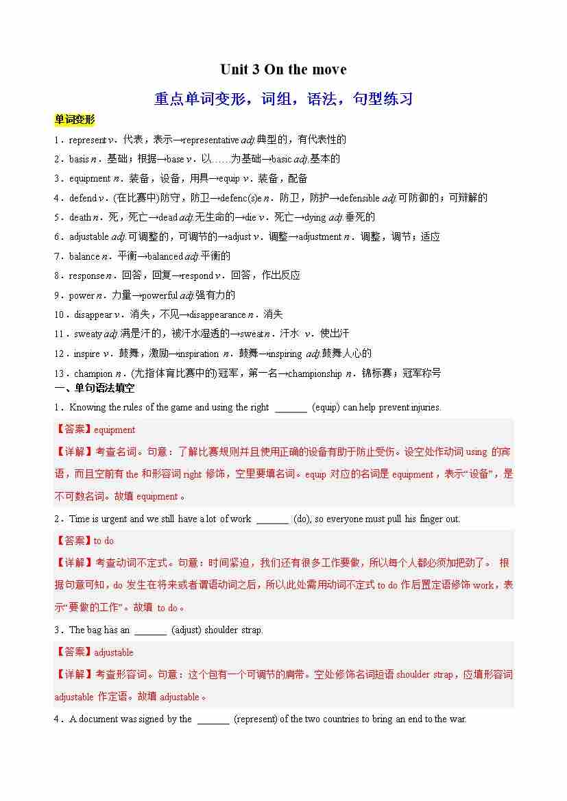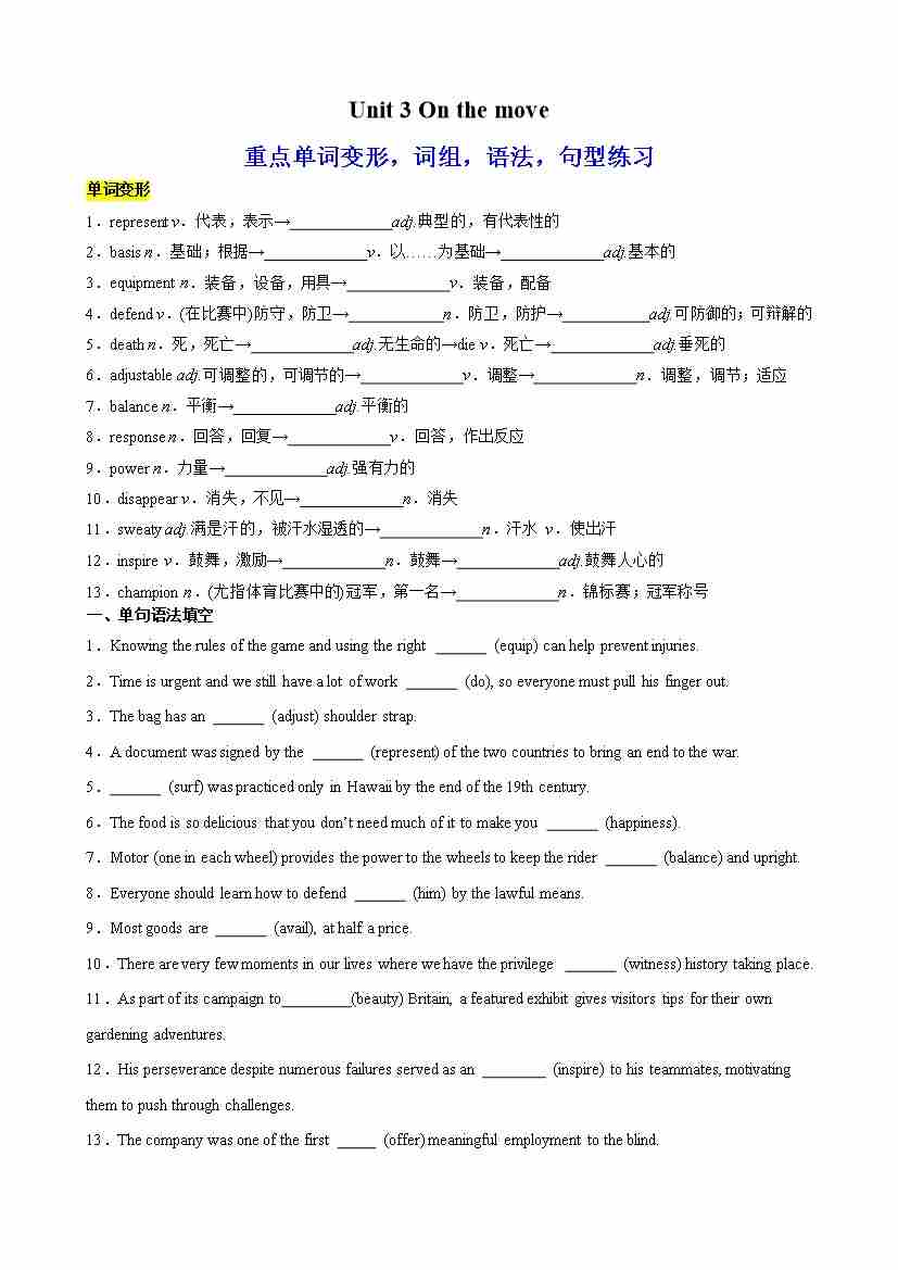 Unit 3 On the move 重点单词变形,语法,短语,句型练习(教师版)