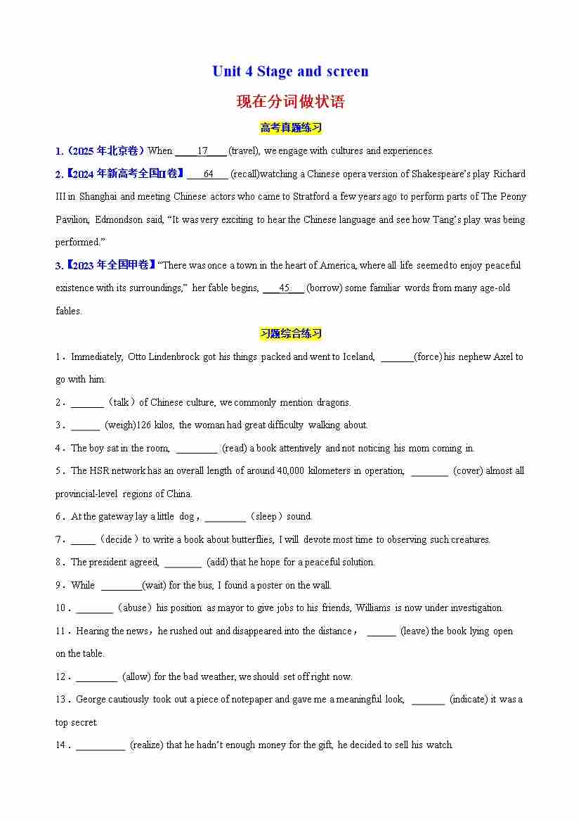 Unit 4 Stage and screen 语法Grammar 现在分词做状语(原卷版)