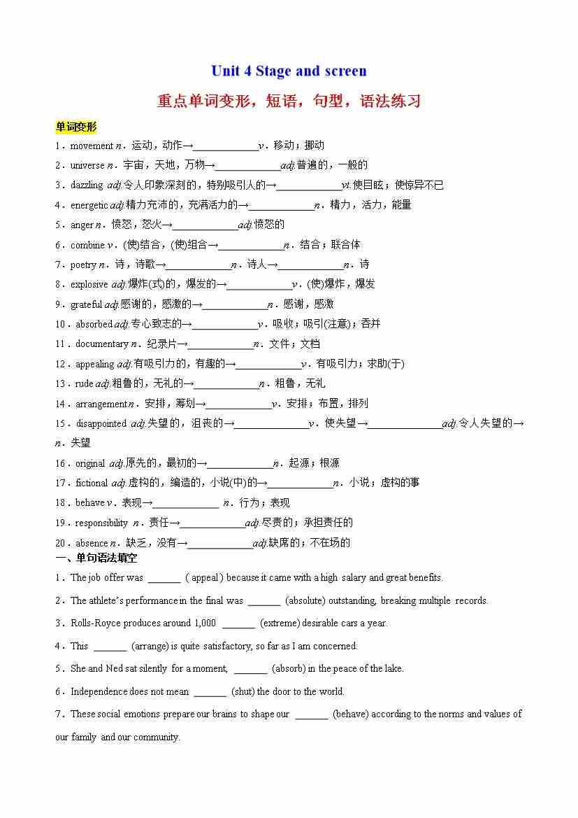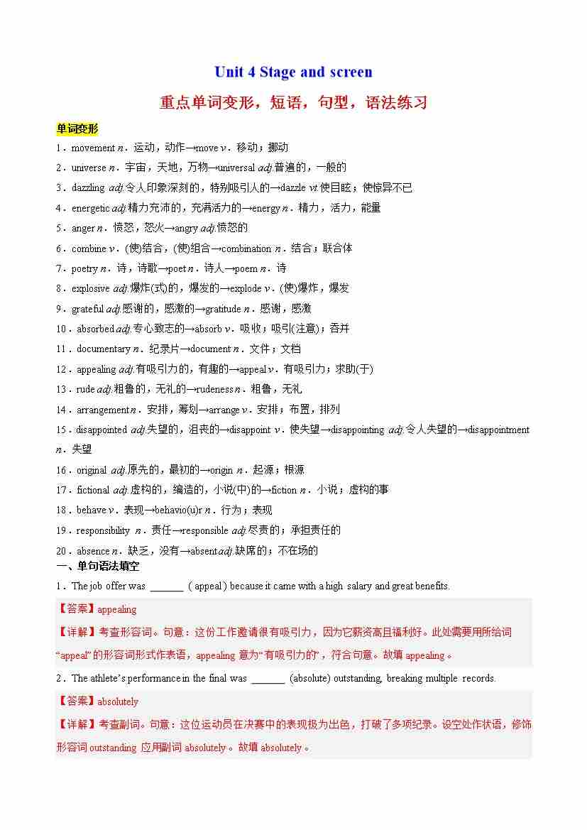 Unit 4 Stage and screen重点单词变形,语法,短语,句型练习(解析版)