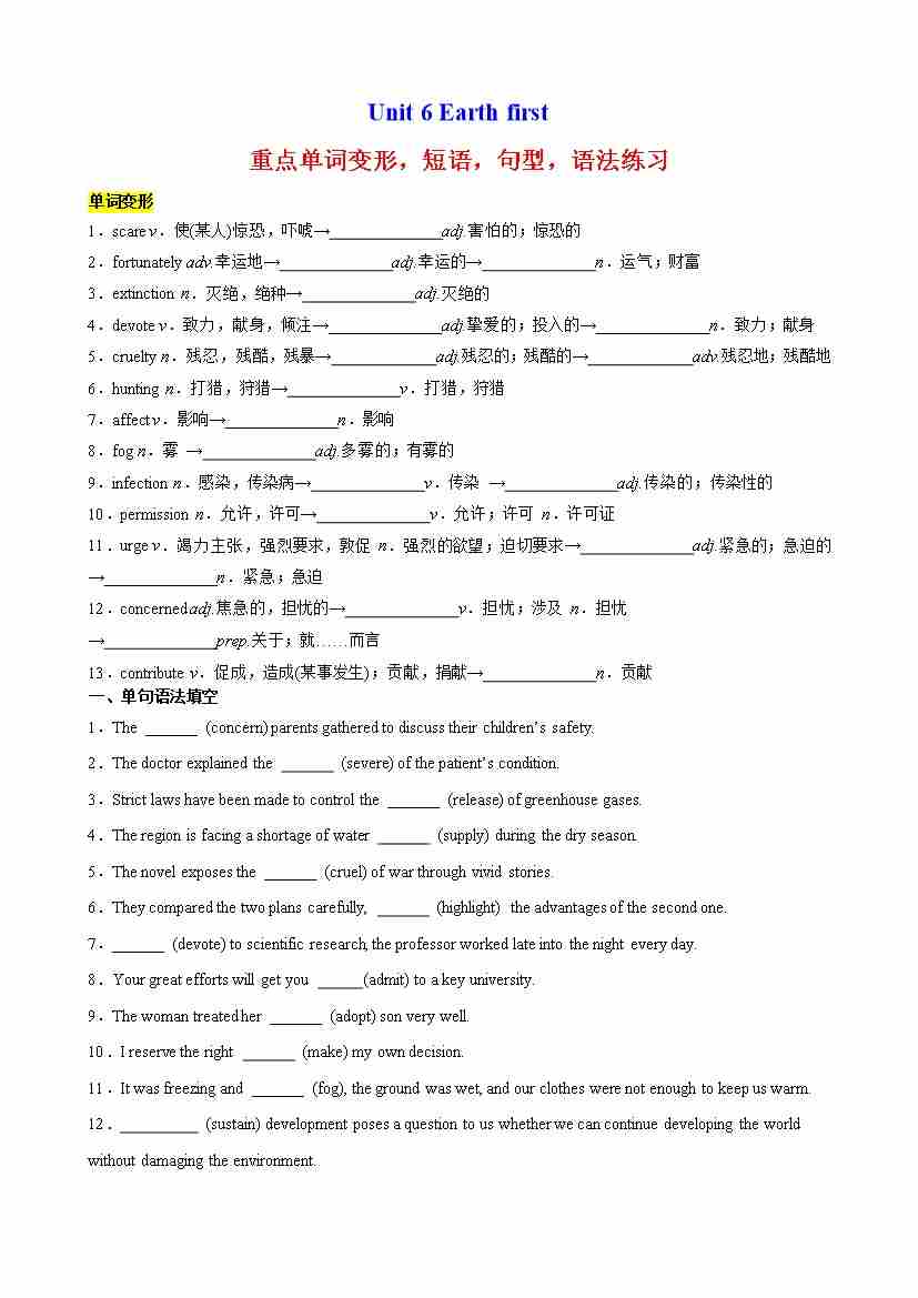 Unit 6 Earth first重点单词变形,语法,短语,句型练习(原卷版)