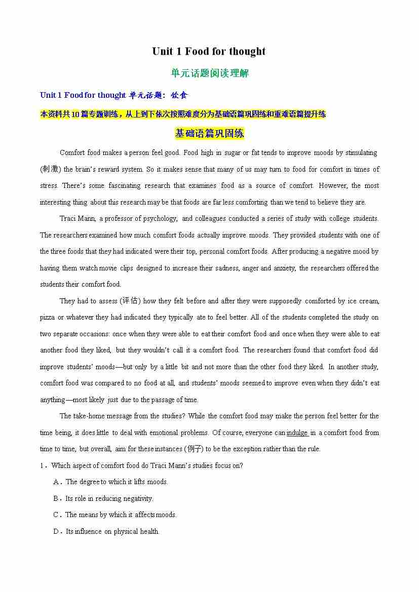 Unit 1 Food for thought单元话题阅读理解练习(学生版)
