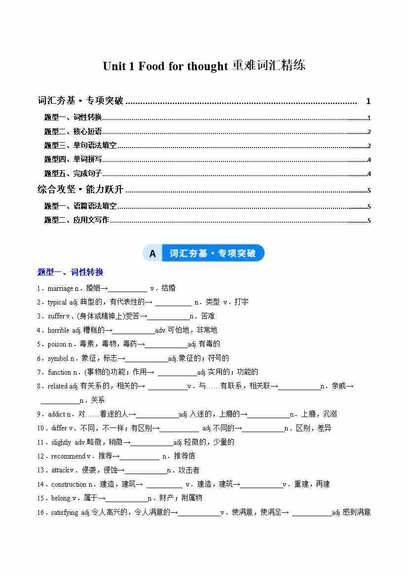 Unit 1 Food for thought(重难词汇精练)(教师版)
