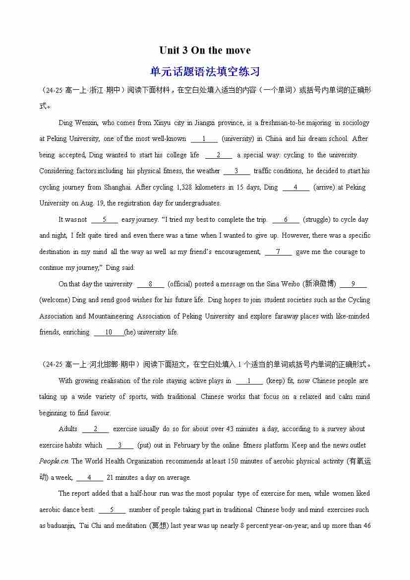 Unit 3 On the move单元话题语法填空练习(原卷版)