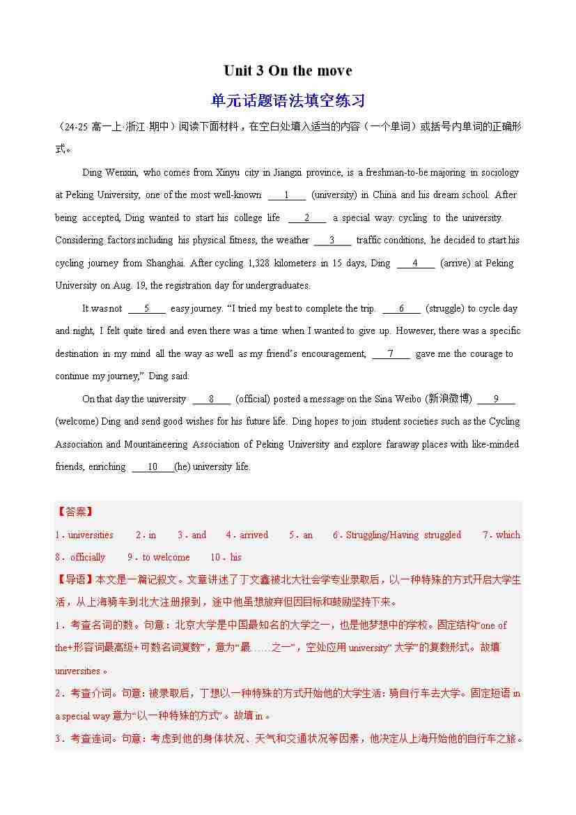 Unit 3 On the move单元话题语法填空练习(解析版)