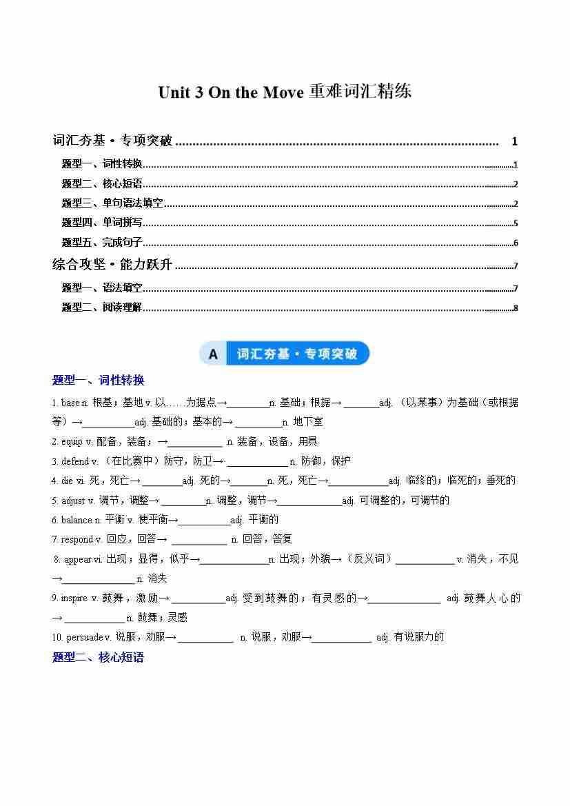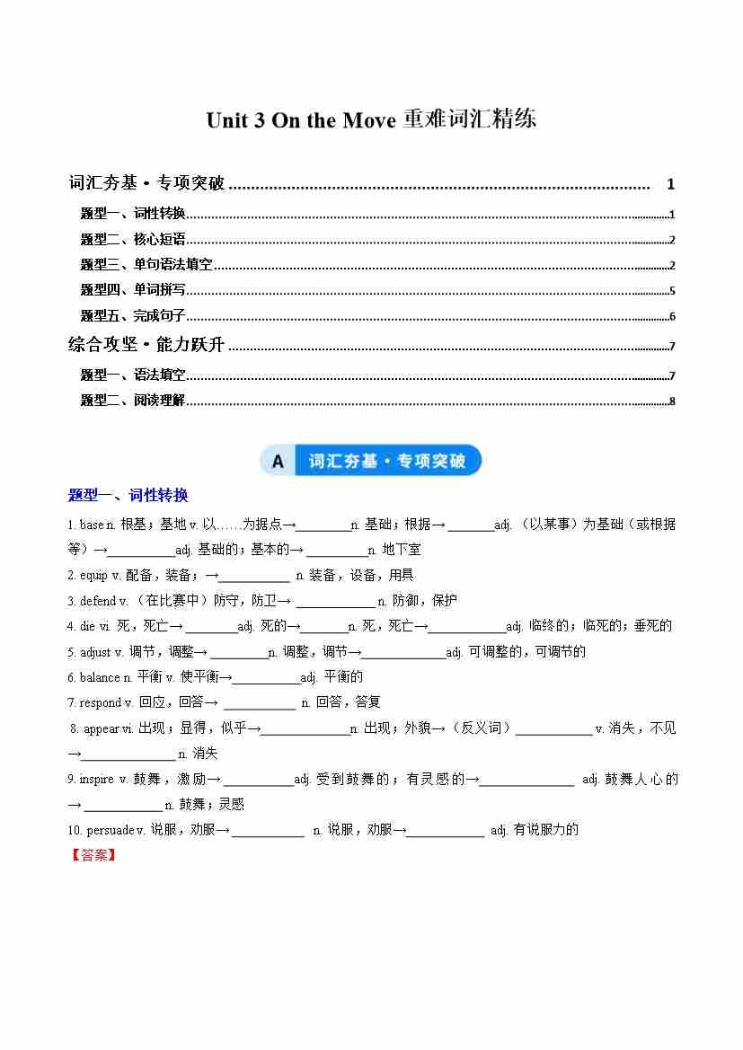 Unit 3 On the move(重难词汇精练)(教师版)
