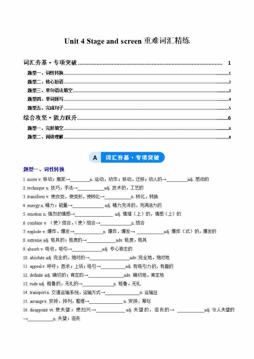 Unit 4 Stage and screen(重难词汇精练)(教师版)