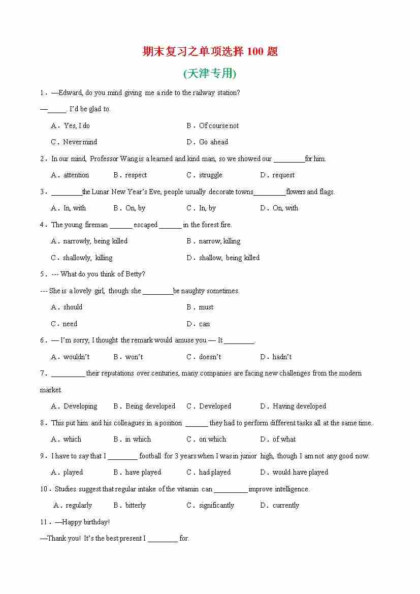 高一英语上学期外研版期末复习之单项选择100题(天津专用)(原卷版)