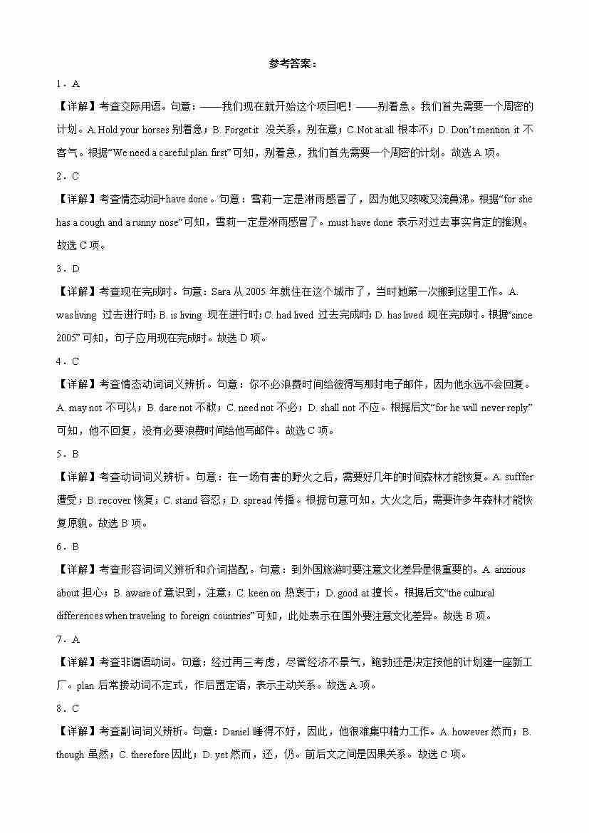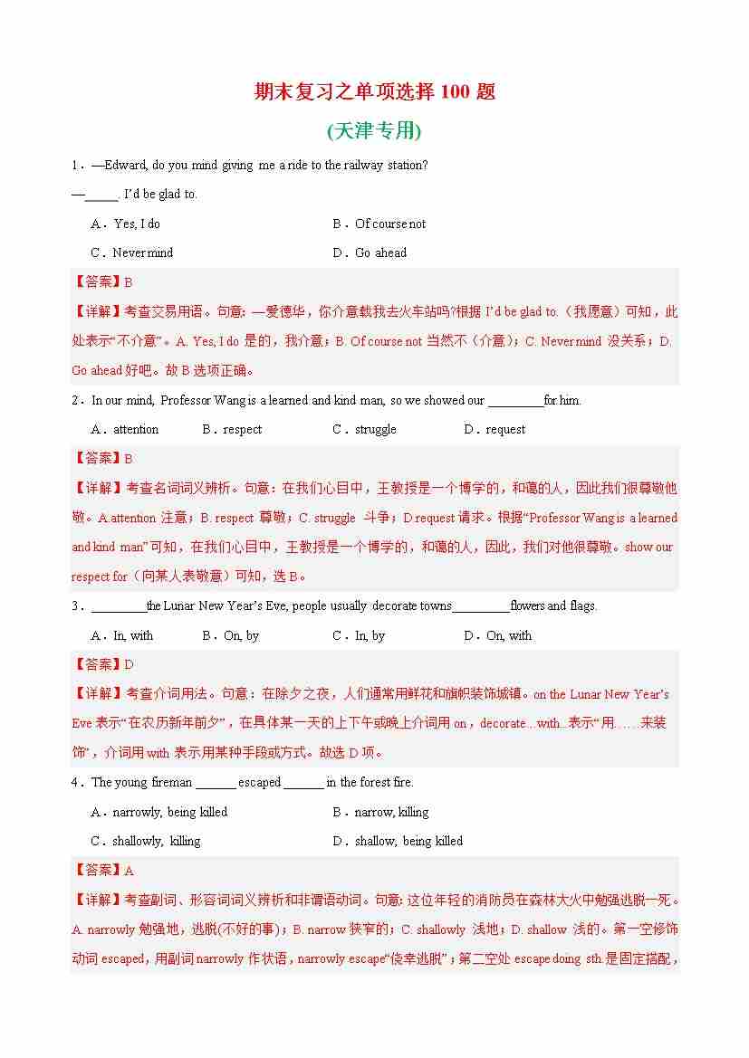 高一英语上学期外研版期末复习之单项选择100题(天津专用)(解析版)