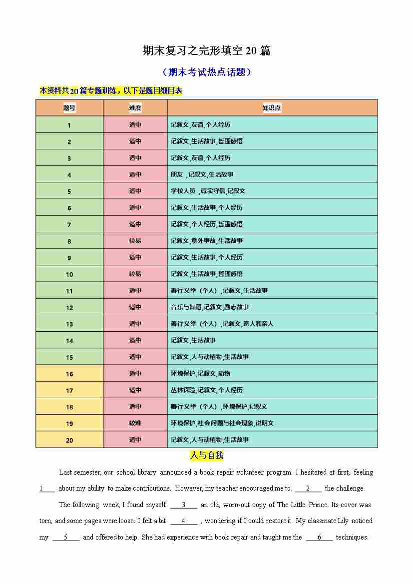 高一英语上学期期末复习之完形填空20篇(期末热点话题)(外研版)(原卷版)
