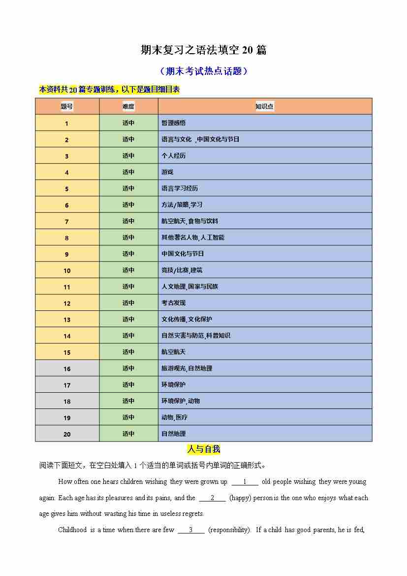 高一英语上学期期末复习之语法填空20篇(期末热点话题)(外研版)(原卷版)