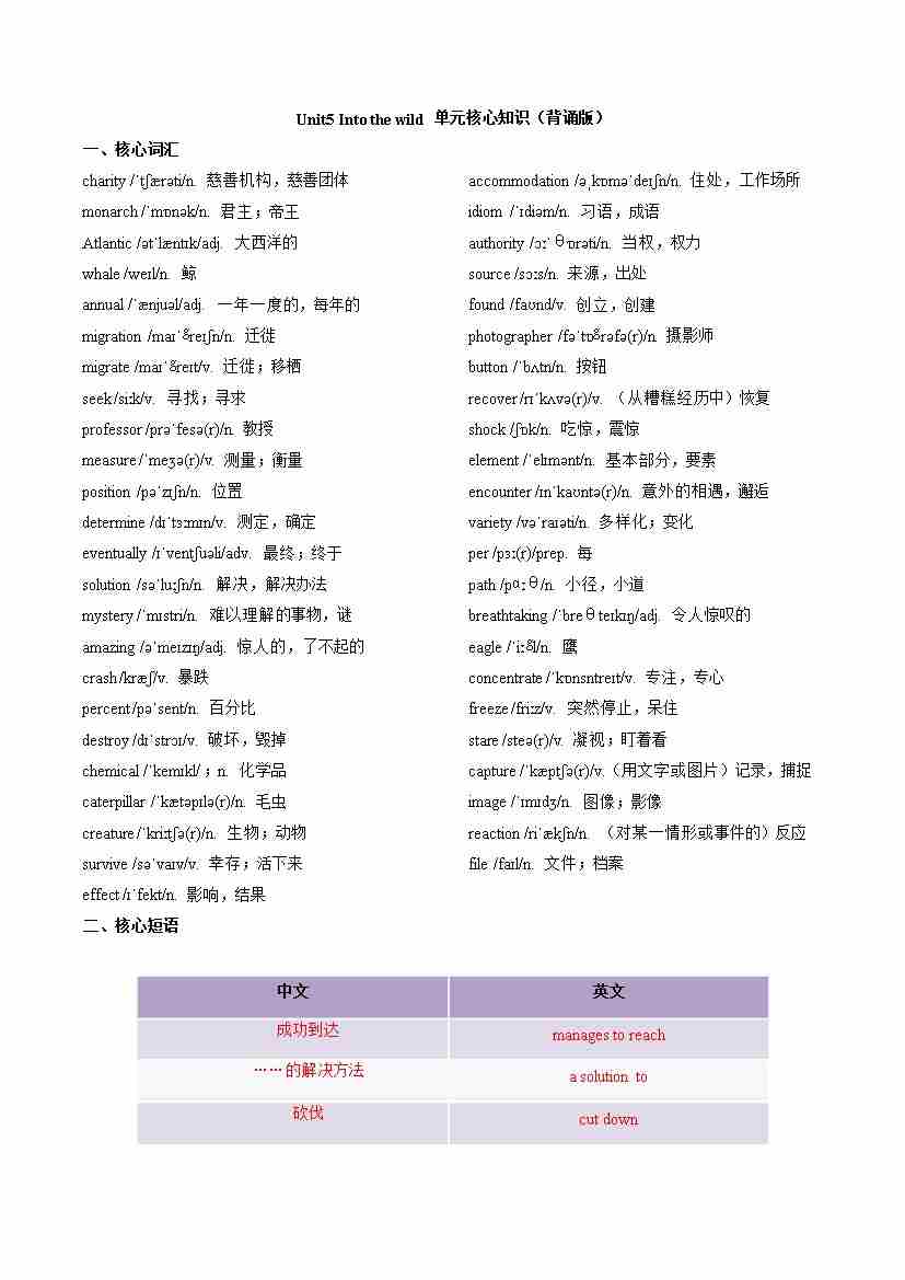 Unit5 Into the wild (单元核心知识)(背诵版)