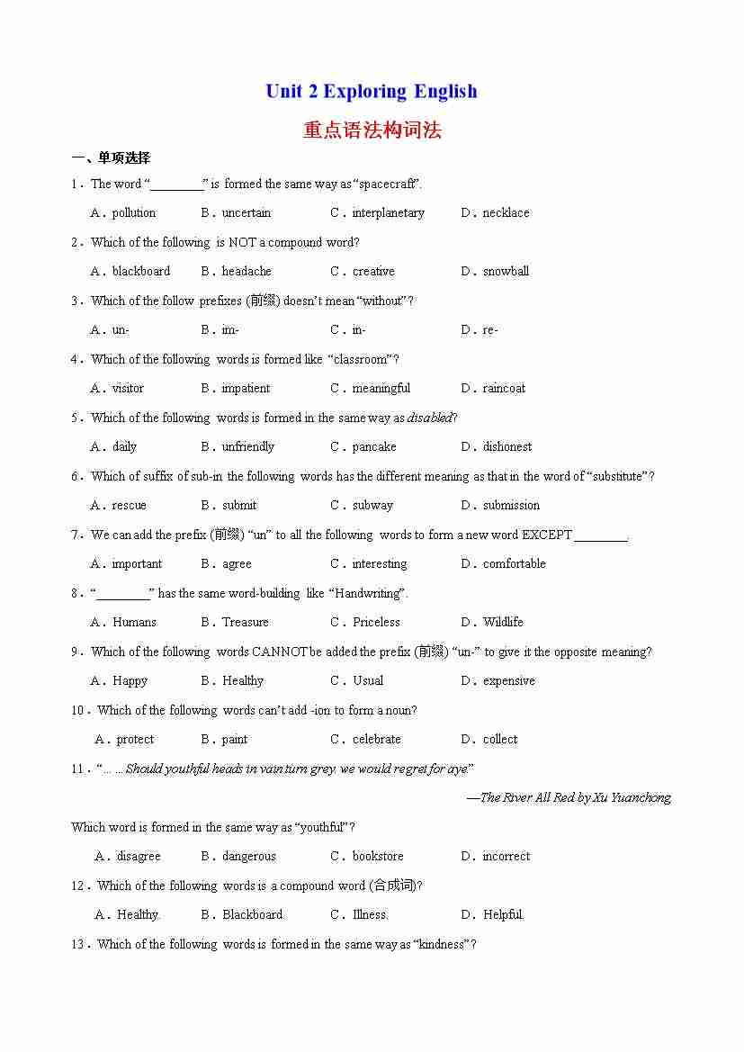 Unit 2 Exploring English 语法Grammar 构词法(学生版)
