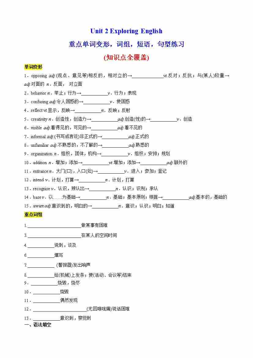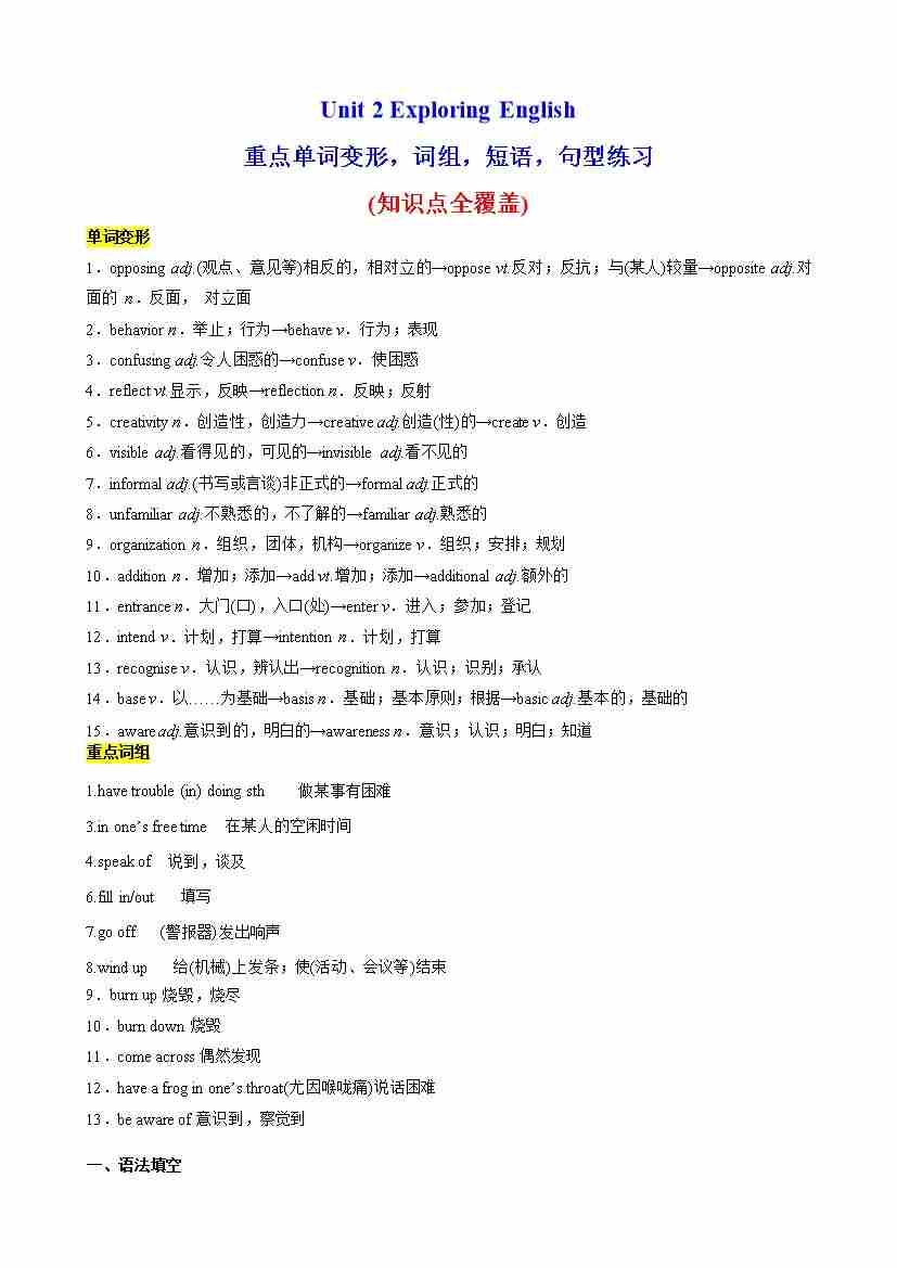 Unit 2 Exploring English 重点单词变形,语法,短语,知识点复习题(学生版)