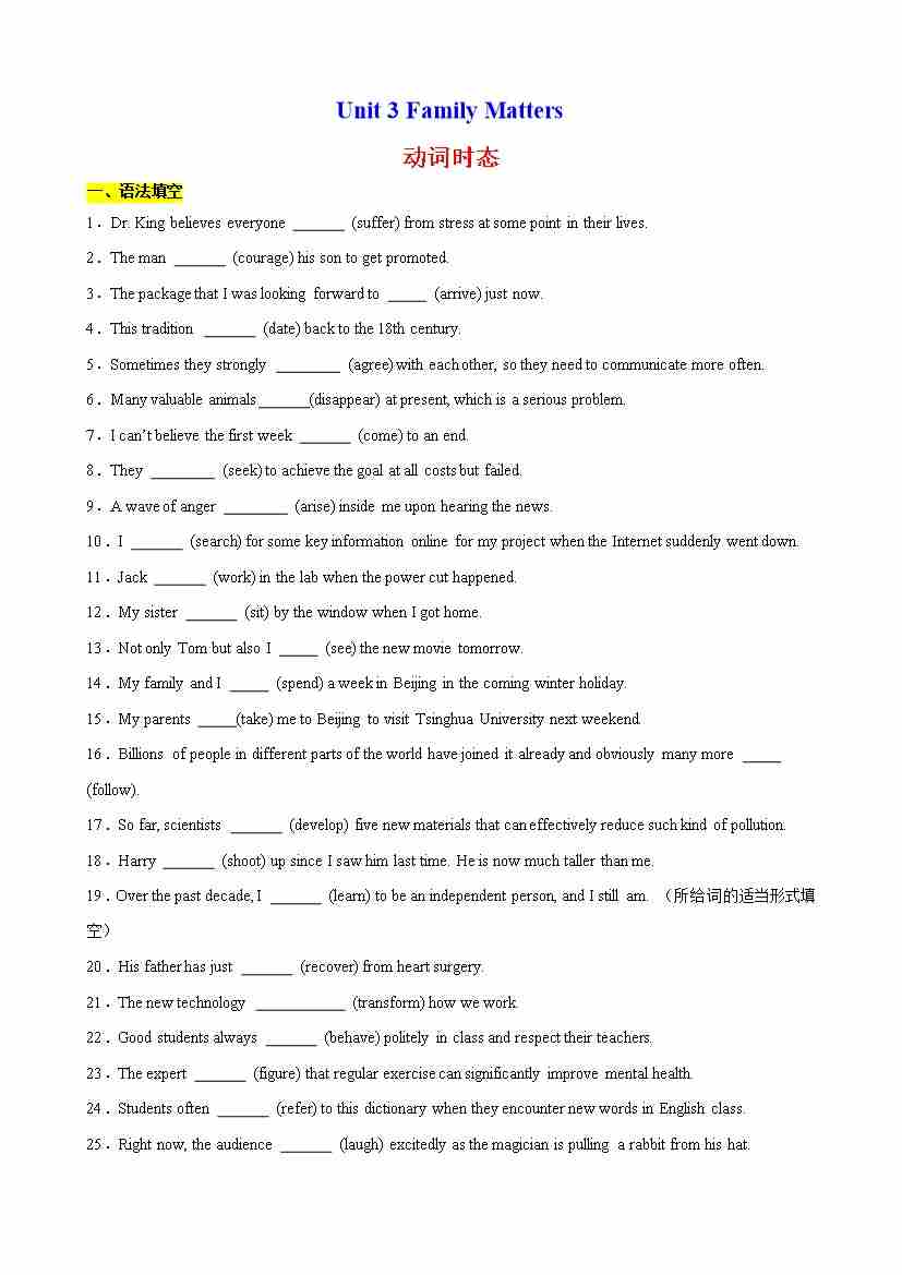 Unit 3 Family matters重点单词变形,语法,短语,知识点复习题(学生版)