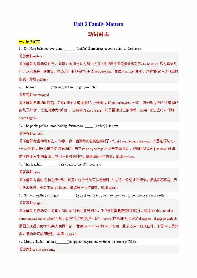 Unit 3 Family Matters 语法Grammar 动词时态(教师版)
