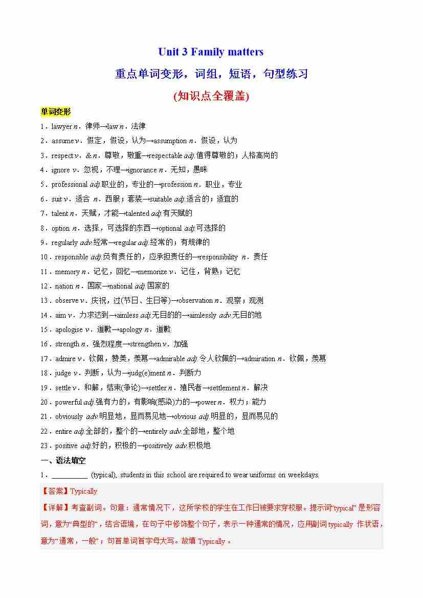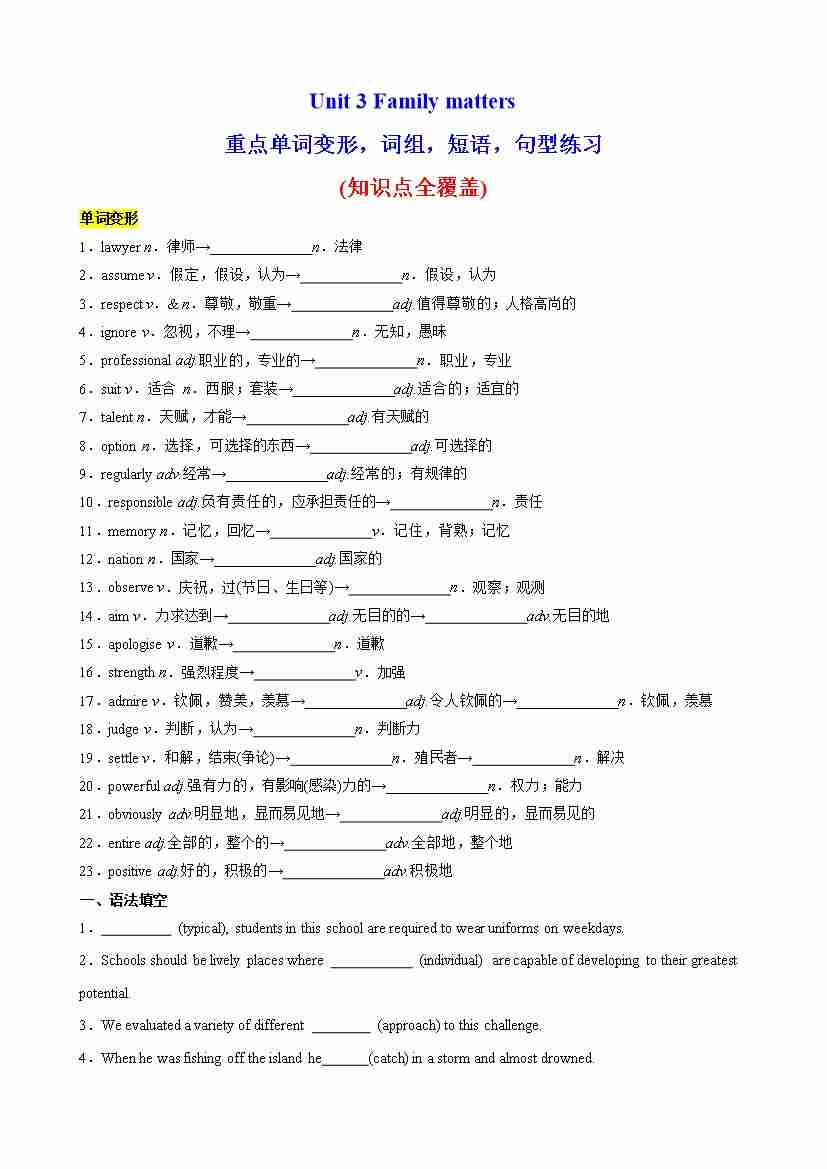 Unit 3 Family matters重点单词变形,语法,短语,知识点复习题(教师版)