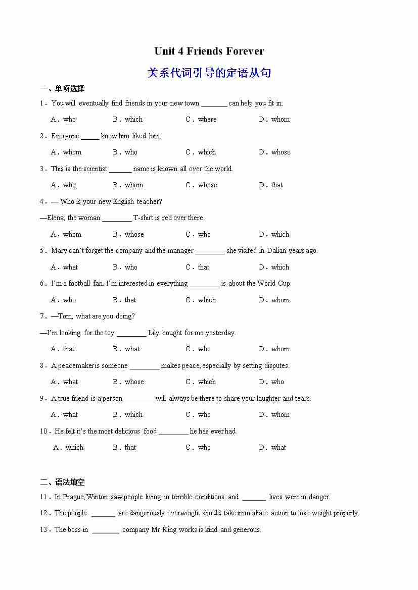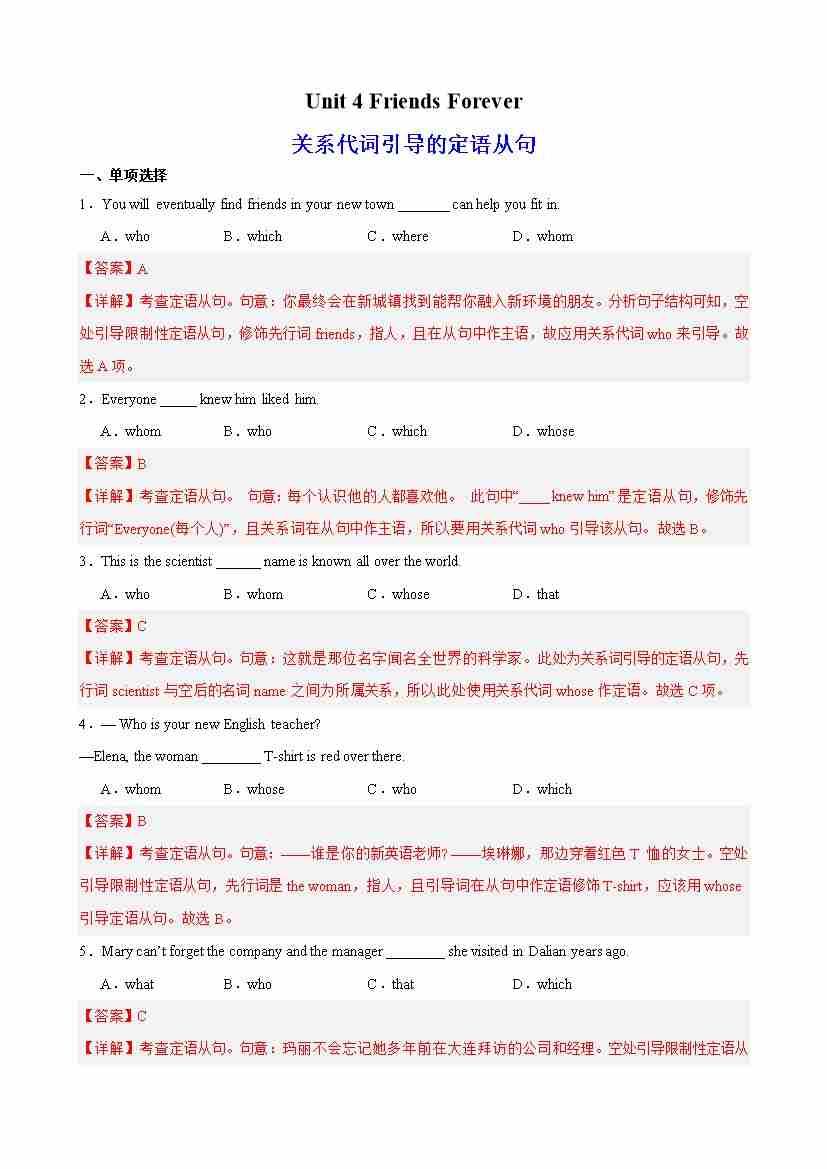 Unit 4 Friends Forever 语法Grammar 关系代词引导的定语从句(教师版)