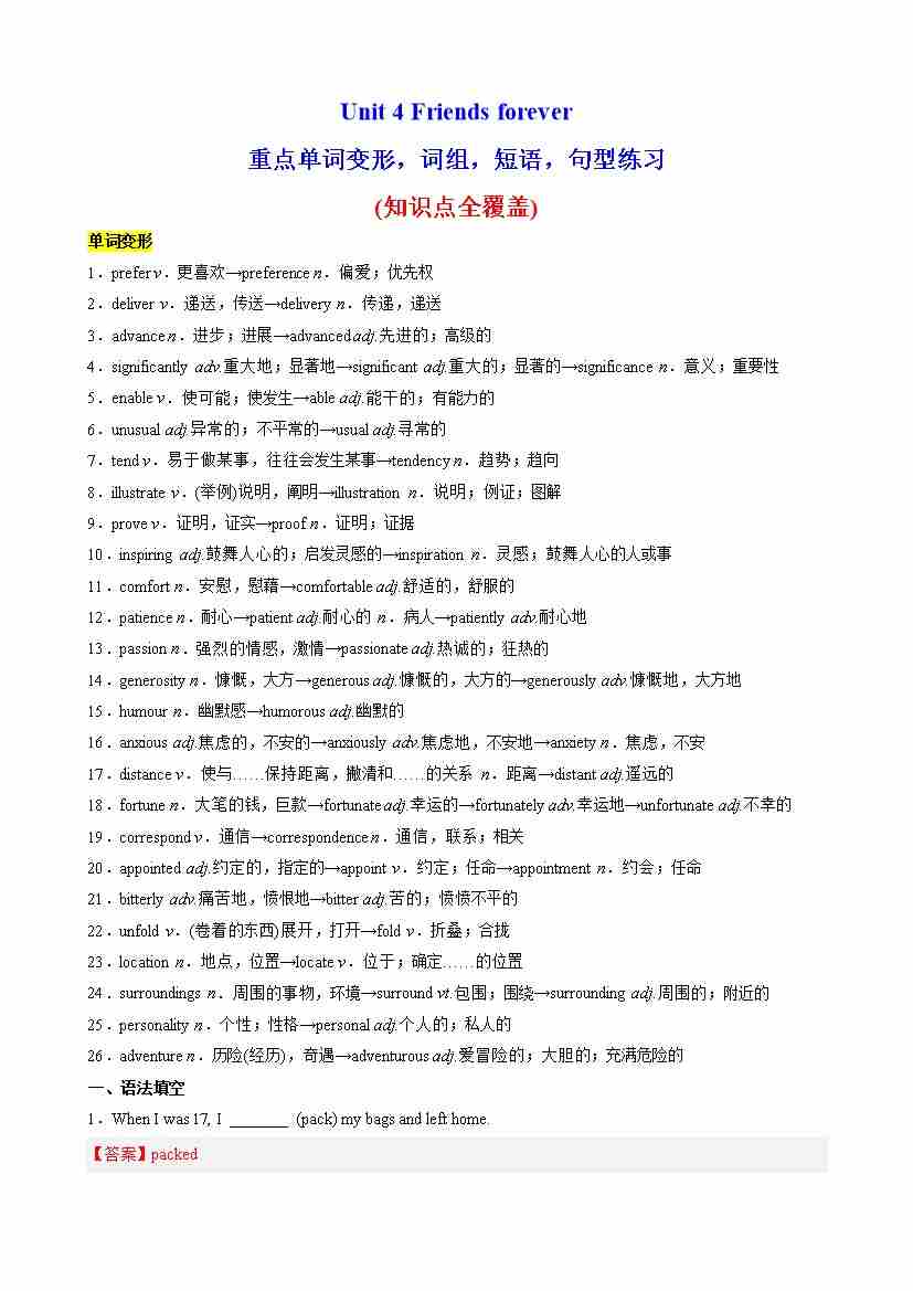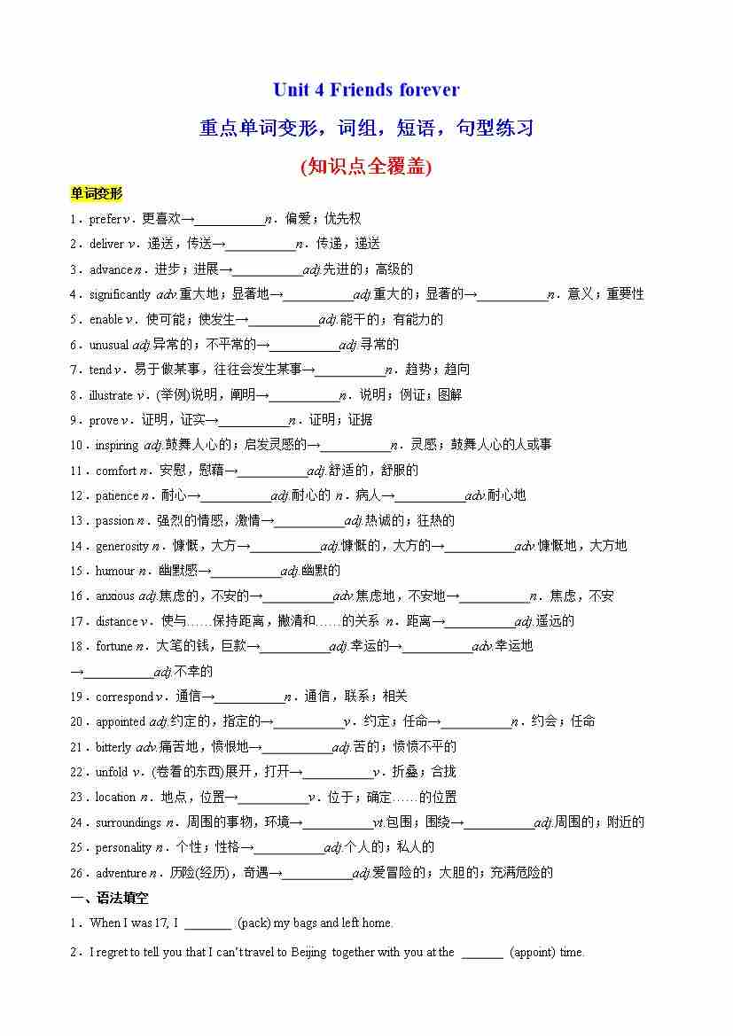 Unit 4 Friends forever重点单词变形,语法,短语,知识点复习题(教师版)