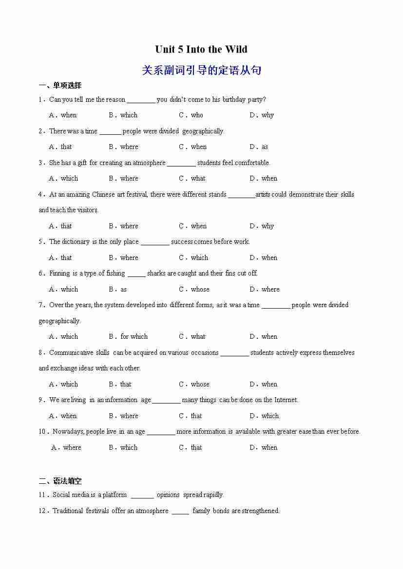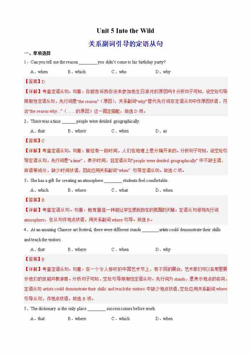 Unit 5 Into the Wild 语法Grammar 关系副词引导的定语从句(教师版)