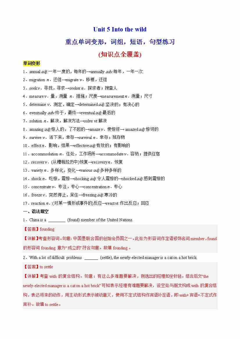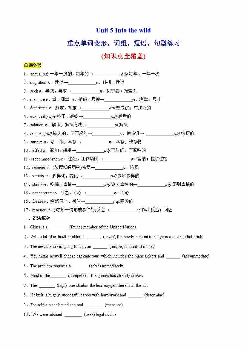 Unit 5 Into the wild重点单词变形,语法,短语,知识点复习题(教师版)