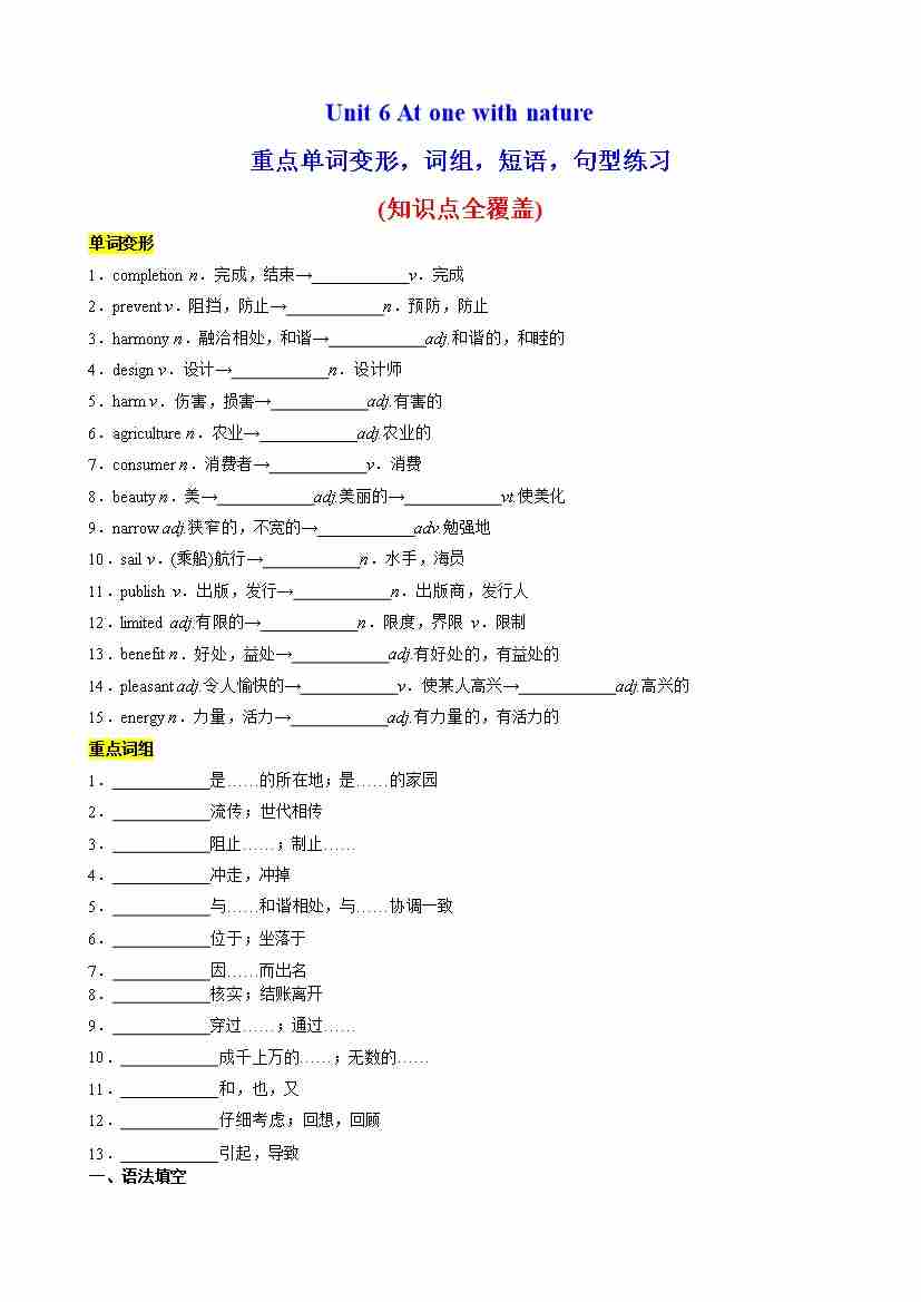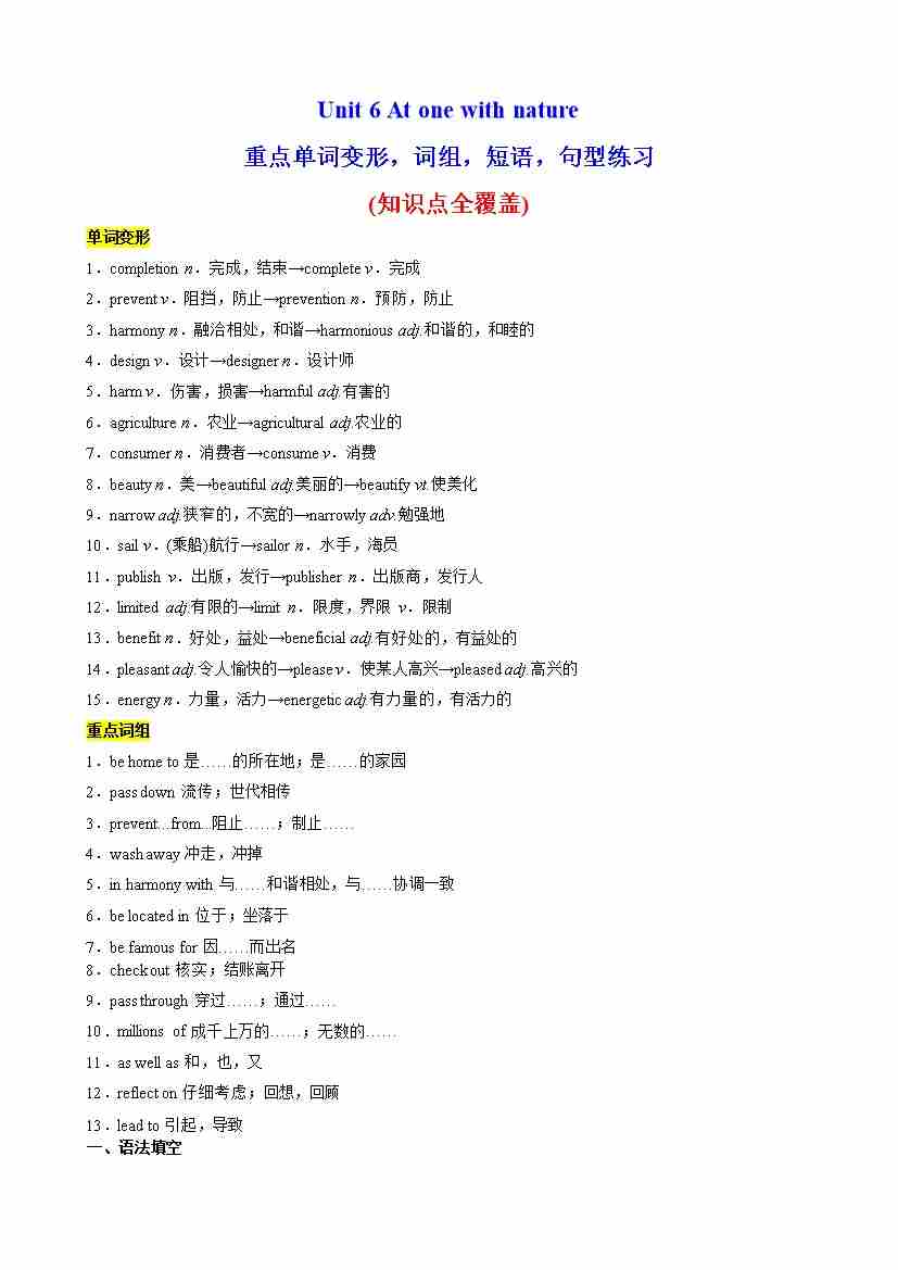 Unit 6 At one with nature重点单词变形,语法,短语,知识点复习题(教师版)