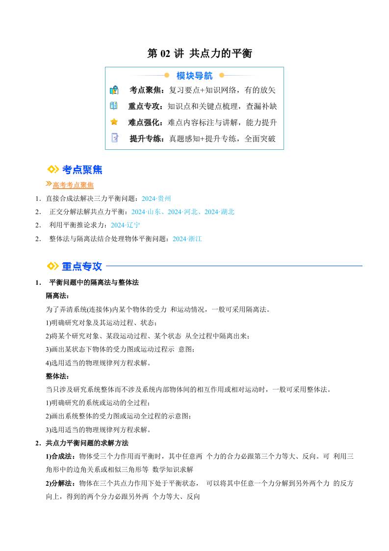 ①寒假复习-第02讲 共点力的平衡(教师版)2025年高一物理寒假衔接讲练 (人教版)