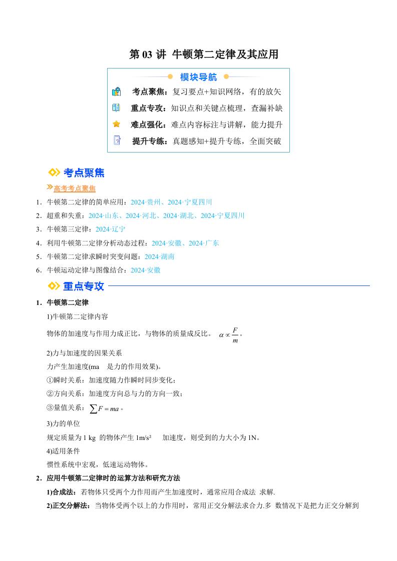 ①寒假复习-第03讲 牛顿第二定律及其应用(学生版)2025年高一物理寒假衔接讲练 (人教版)
