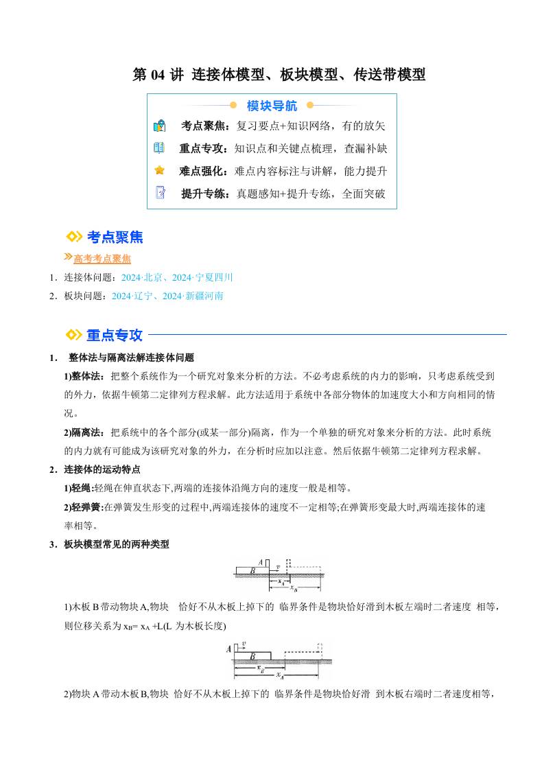 ①寒假复习-第04讲 连接体模型、板块模型、传送带模型(学生版)2025年高一物理寒假衔接讲练 (人教版)