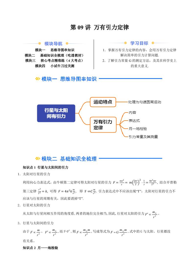 ②寒假预习-第09讲 万有引力定律(学生版)2025年高一物理寒假衔接讲练 (人教版)