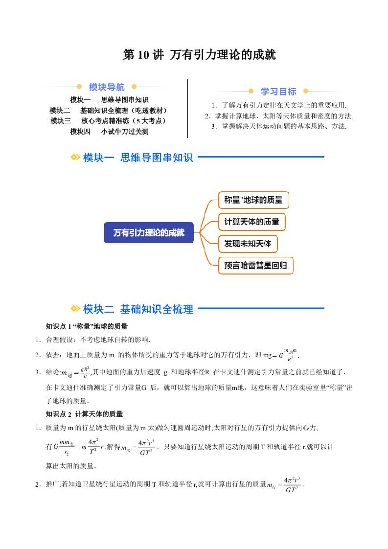 ②寒假预习-第10讲 万有引力理论的成就(学生版)2025年高一物理寒假衔接讲练 (人教版)