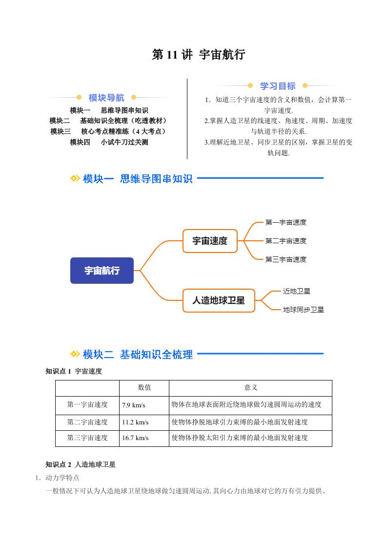 ②寒假预习-第11讲 宇宙航行(学生版)2025年高一物理寒假衔接讲练 (人教版)