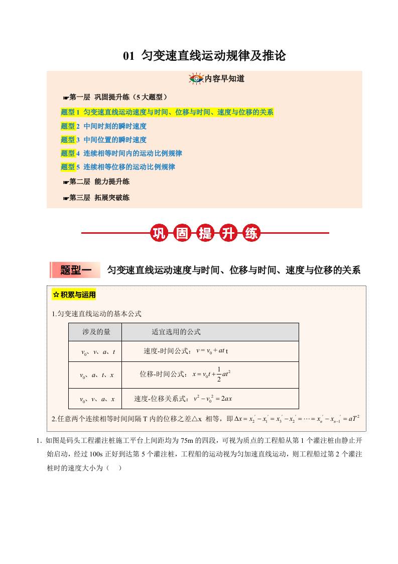 ③寒假提升练-01 匀变速直线运动规律及推论(学生版)2025年高一物理寒假衔接讲练 (人教版)