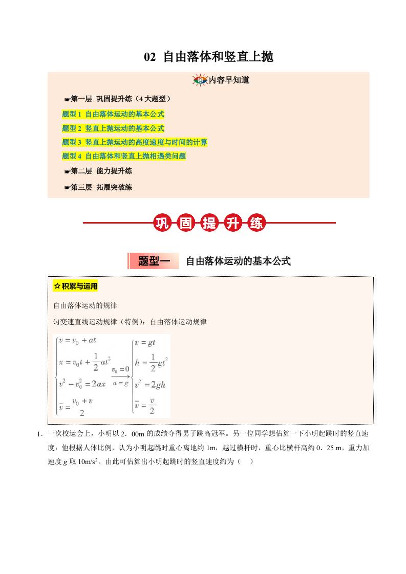 ③寒假提升练-02 自由落体和竖直上抛(学生版)2025年高一物理寒假衔接讲练 (人教版)