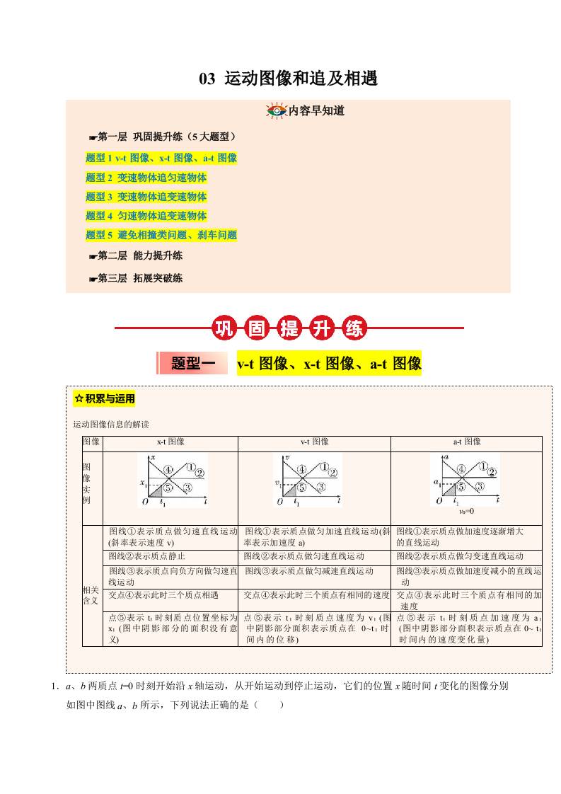 ③寒假提升练-03 运动图像和追及相遇(教师版)2025年高一物理寒假衔接讲练 (人教版)