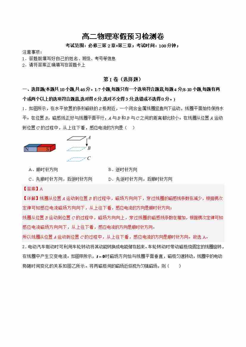 高二物理寒假预习阶段检测卷(教师版)2025年高二物理寒假衔接讲练 (人教版)