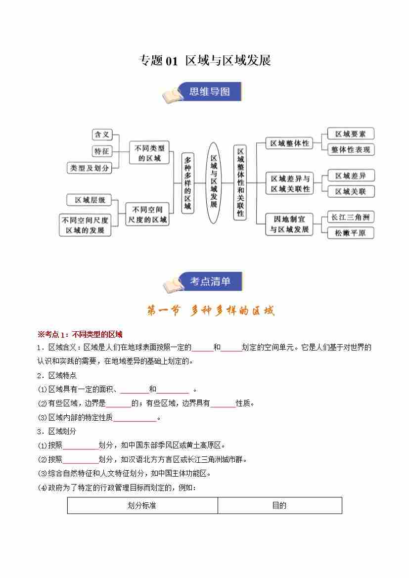 选修一地理专题01 区域与区域发展(期末复习知识清单)(挖空版)