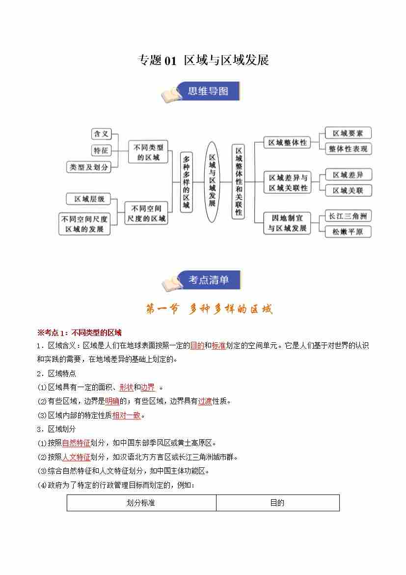 选修一地理专题01 区域与区域发展(期末复习知识清单)(教师版)